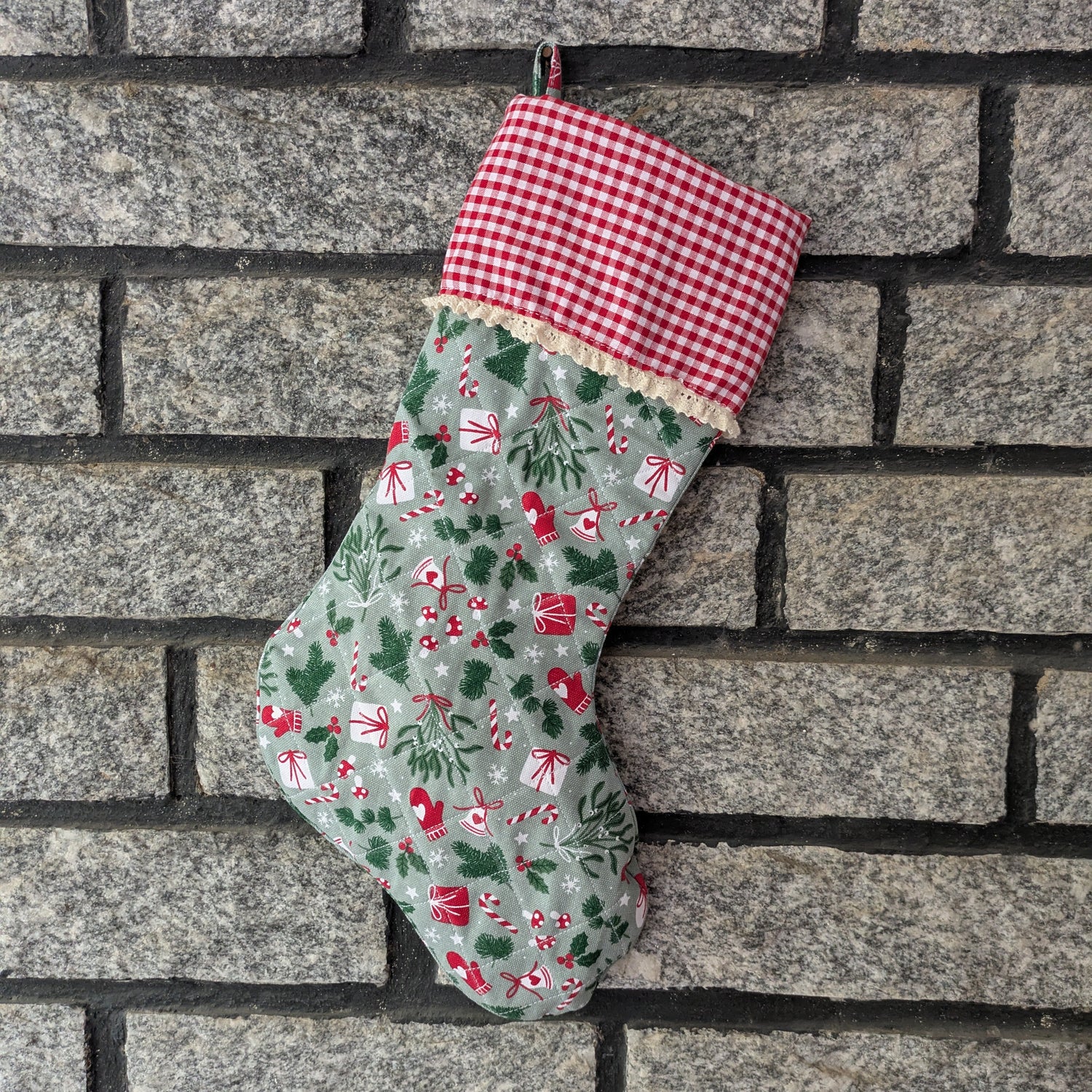 A perfect place for the Christmas gifts for the family or to hang as a decor piece... these stockings are made in Christmas print cotton and finished with a gingham cotton cuff with lace edge. The front panel of the quilt has been quilted.