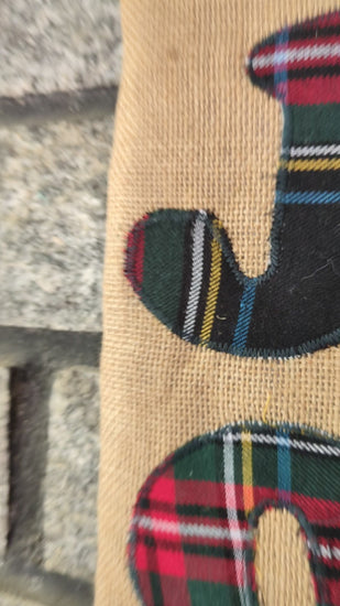 Christmas-themed wall art, the letters are machine appliqued on natural colour burlap. Buffalo checks paired with burlap gives a frugal, farm house Christmas vibes.