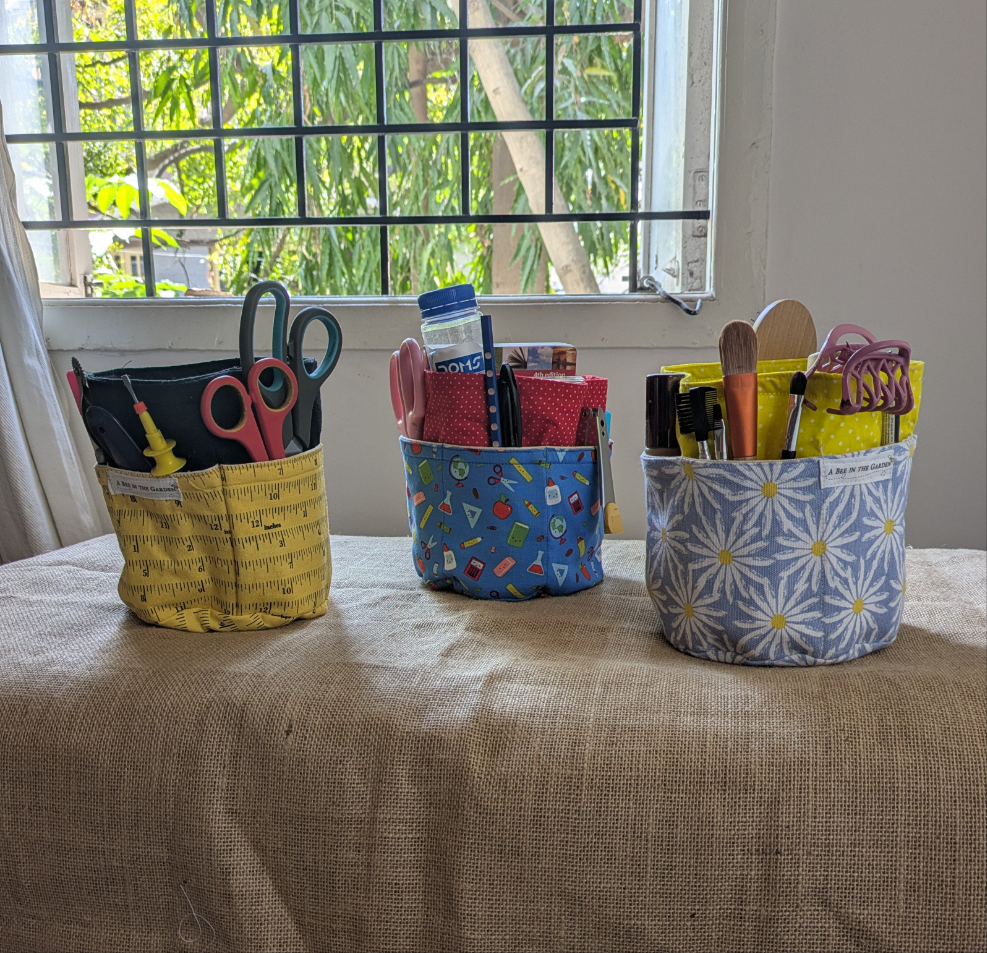 Desk top caddy made in cotton fabric with pockets all around to store all sorts of knick knacks. Great to be used in a study, office desk, kids room or craft room.