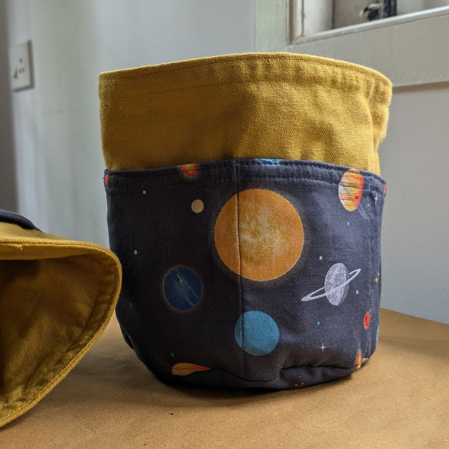 Desk top caddy made in cotton fabric with pockets all around to store all sorts of knick knacks. Great to be used in a study, office desk, kids room or craft room.