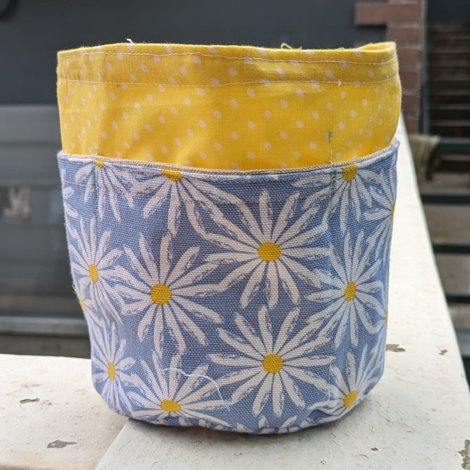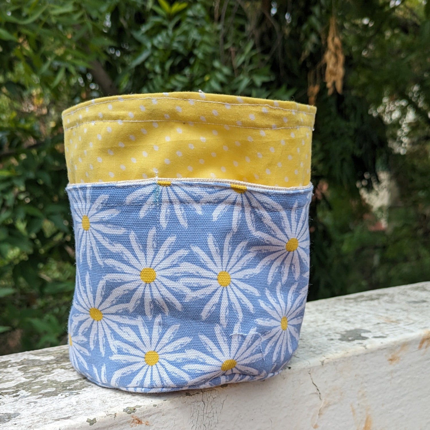 Desk top caddy made in cotton fabric with pockets all around to store all sorts of knick knacks. Great to be used in a study, office desk, kids room or craft room.