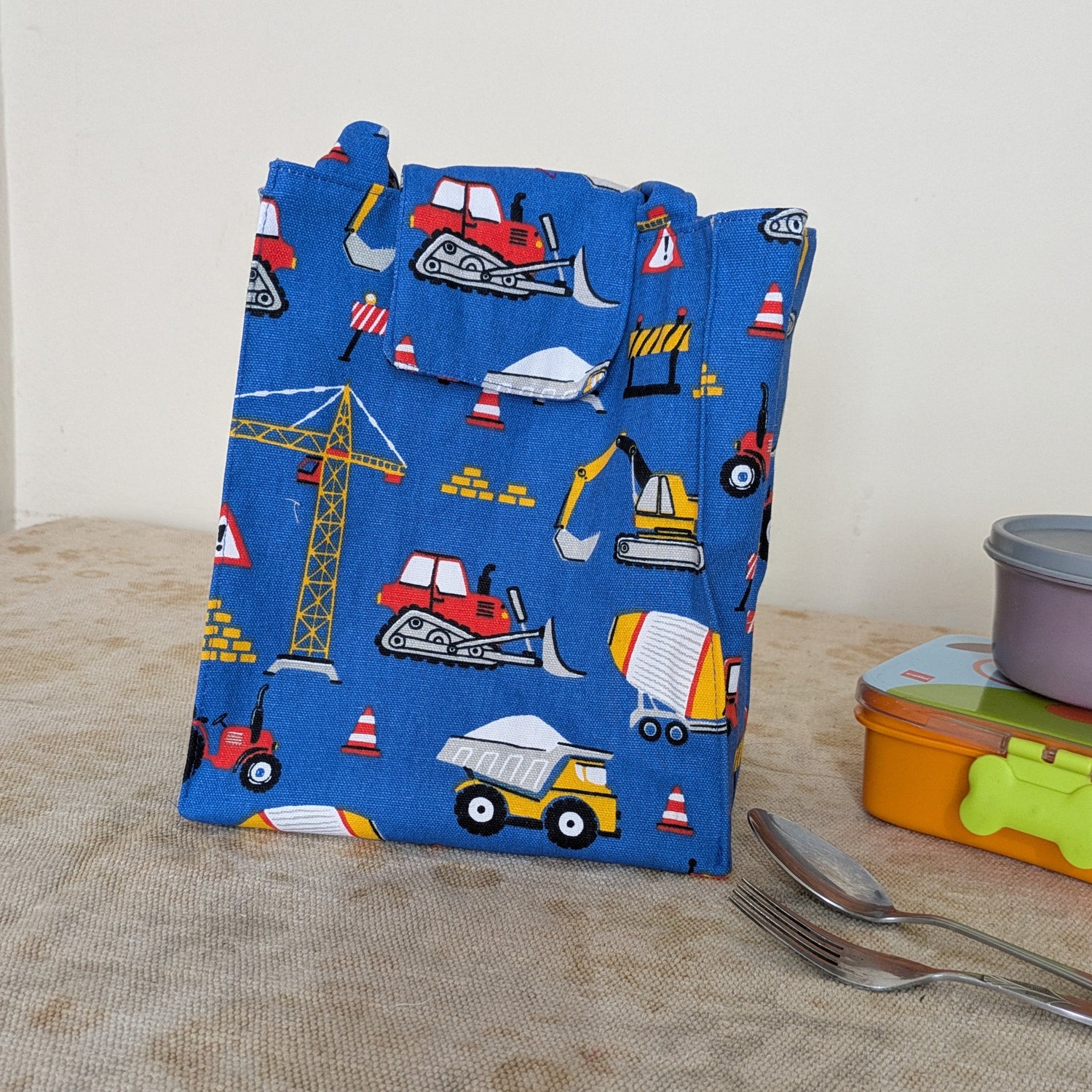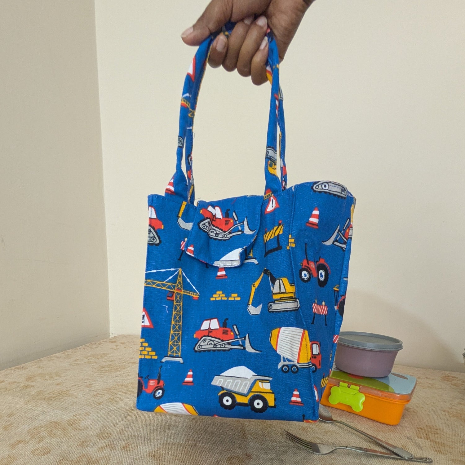 Carry your lunch in style with this spacious cotton lunch bag. This can easily fit a day's meals , in one or more lunch boxes along with cutlery and a bottle.