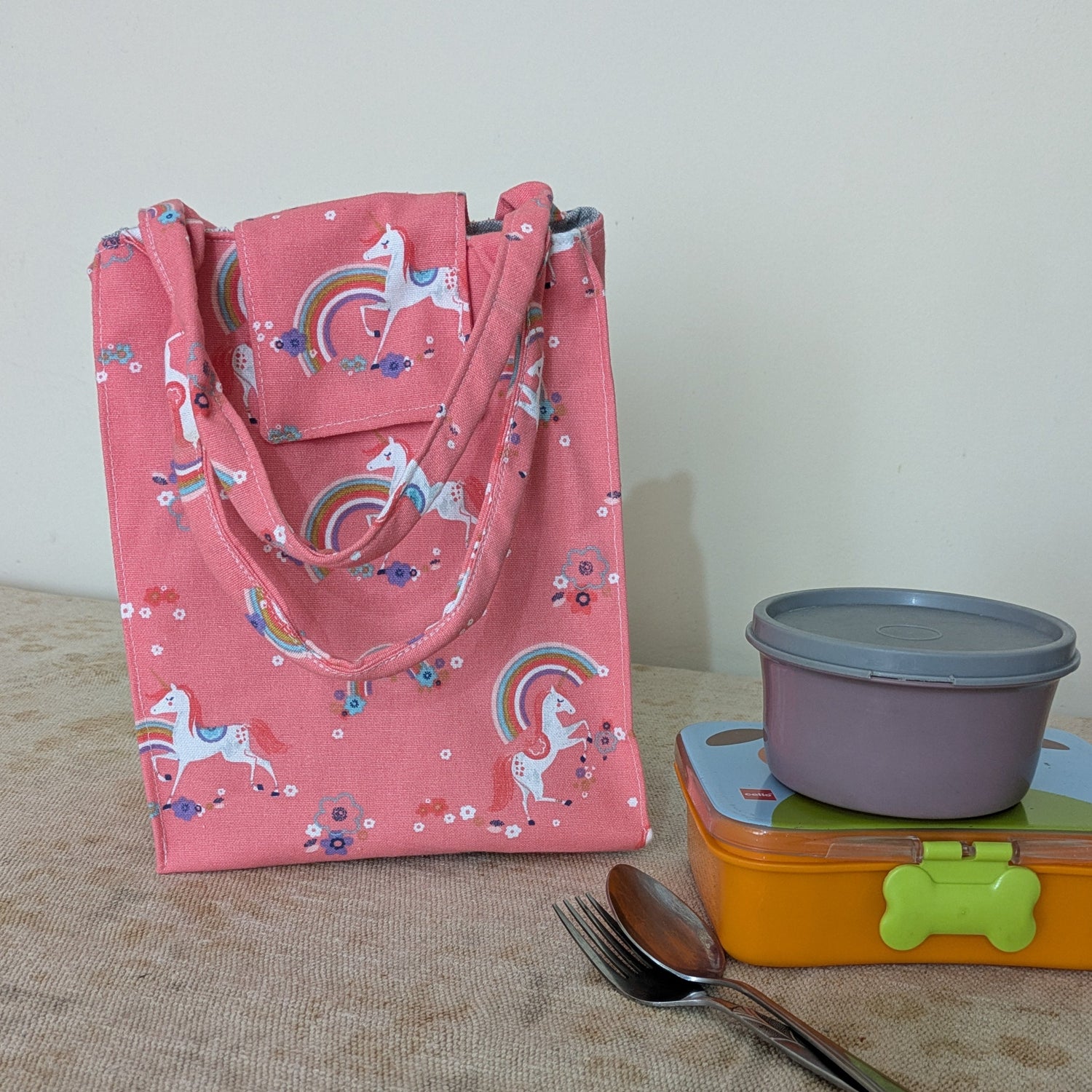Carry your lunch in style with this spacious cotton lunch bag. This can easily fit a day's meals , in one or more lunch boxes along with cutlery and a bottle.