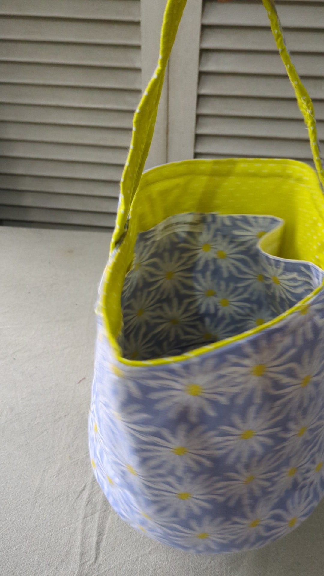 It is a quilted basket with a detachable handle and comes with inside pockets to store your day's tools and supplies while working on your favorite crafts.
