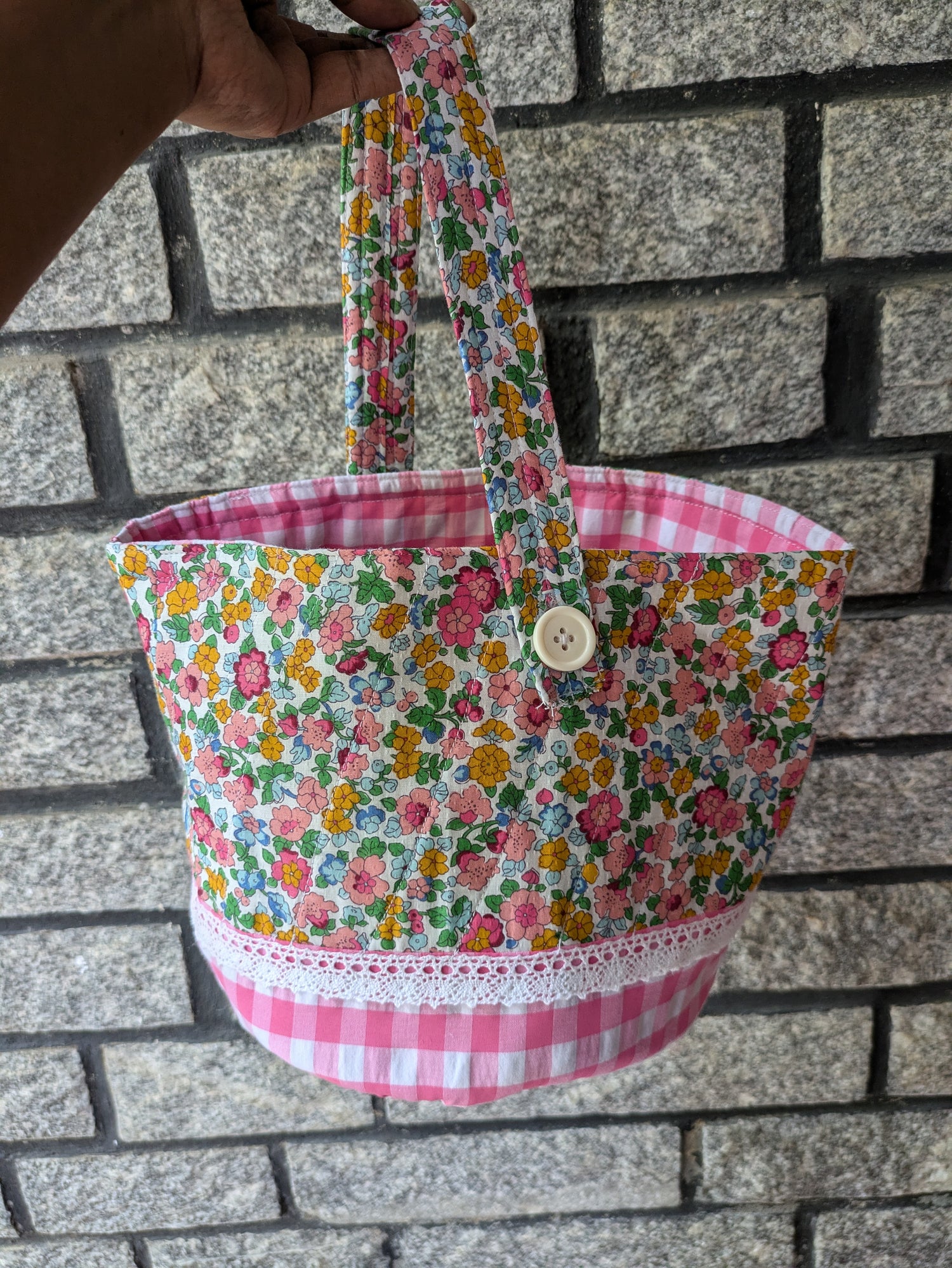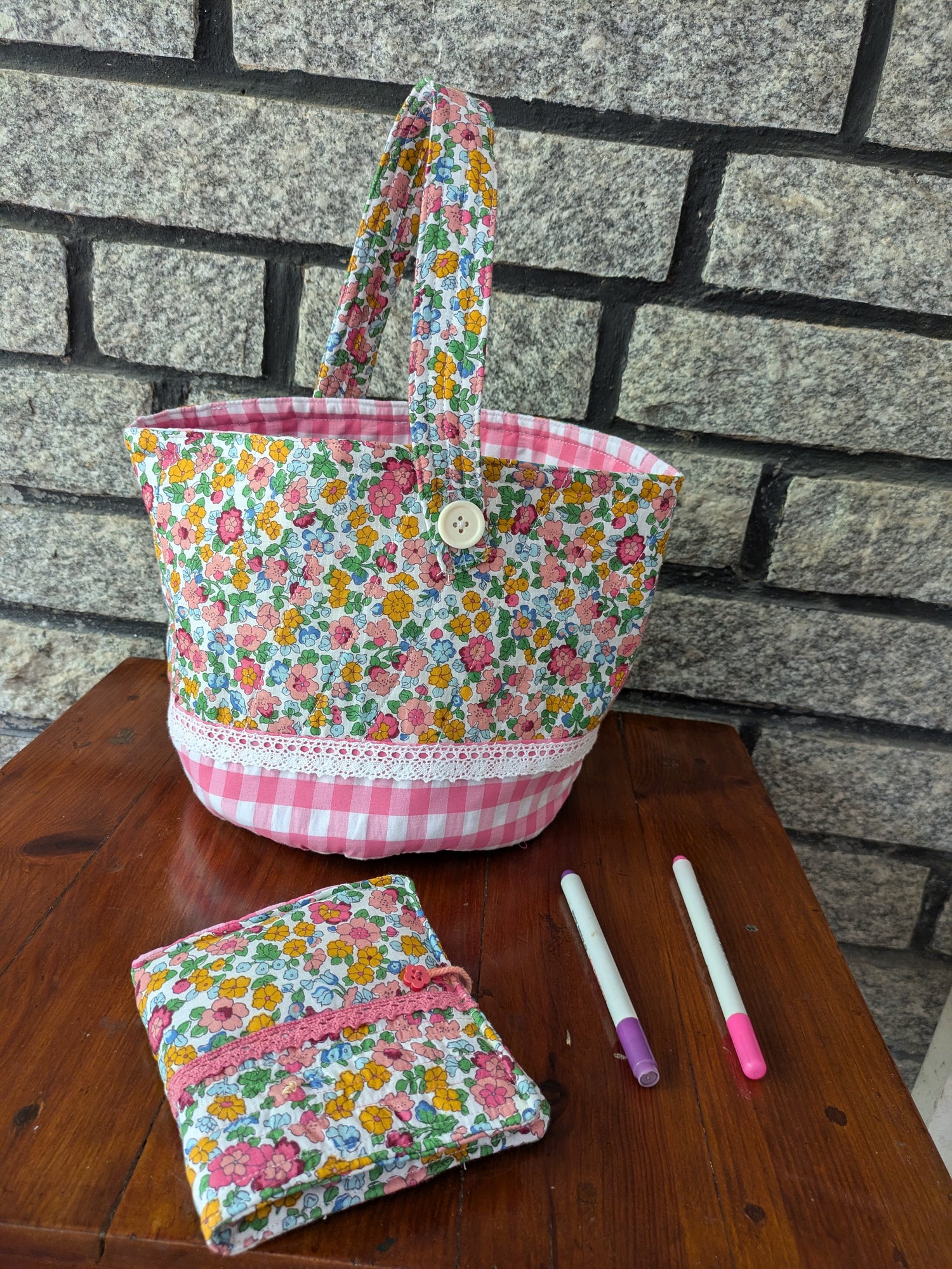 It is a quilted basket with a detachable handle and comes with inside pockets to store your day's tools and supplies while working on your favorite crafts.