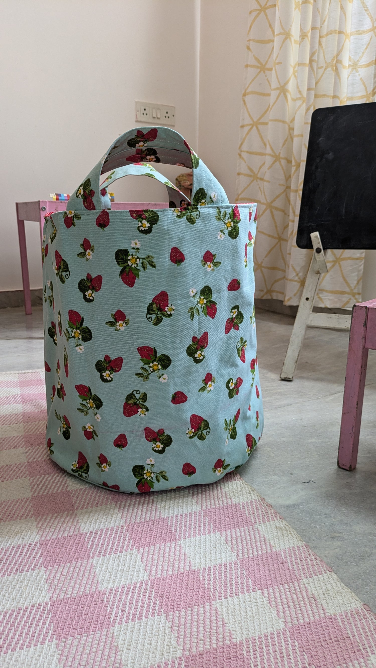 Large size fabric basket made in cotton . Great to organize toys and knick knacks in kids room, equally loved as a laundry basket and for general storage in and around any home... also a great storage solution for yarn hoarders. Reversible, comes with a tie-uo drawstring closure.