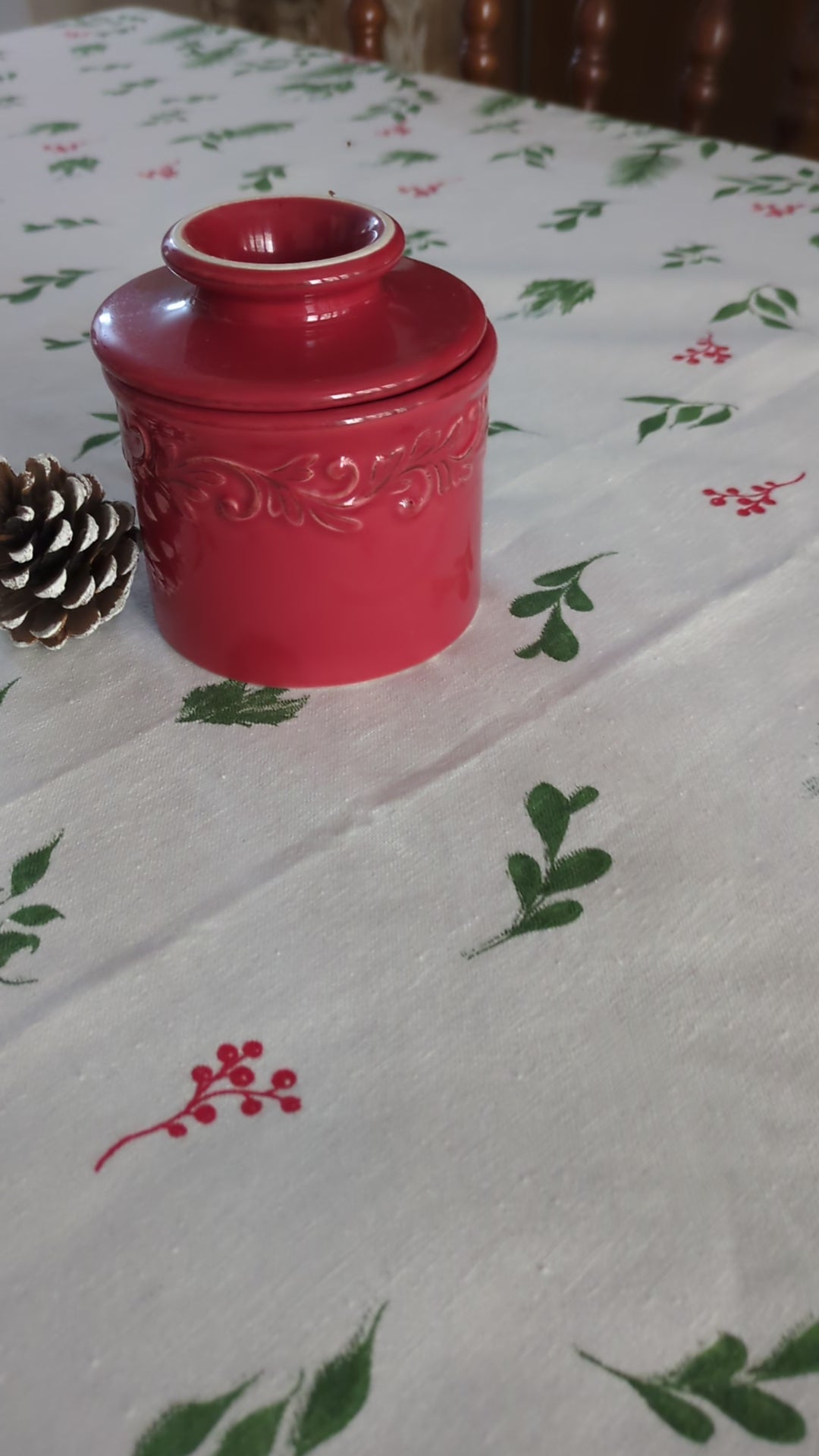 Table cover made in pure cotton . Features and all over scarce leaf print with a rich and dense print off pines, pine cones and berries on the ling edges. The red border gives it the perfect pop of colour, with a lace edge detailing.