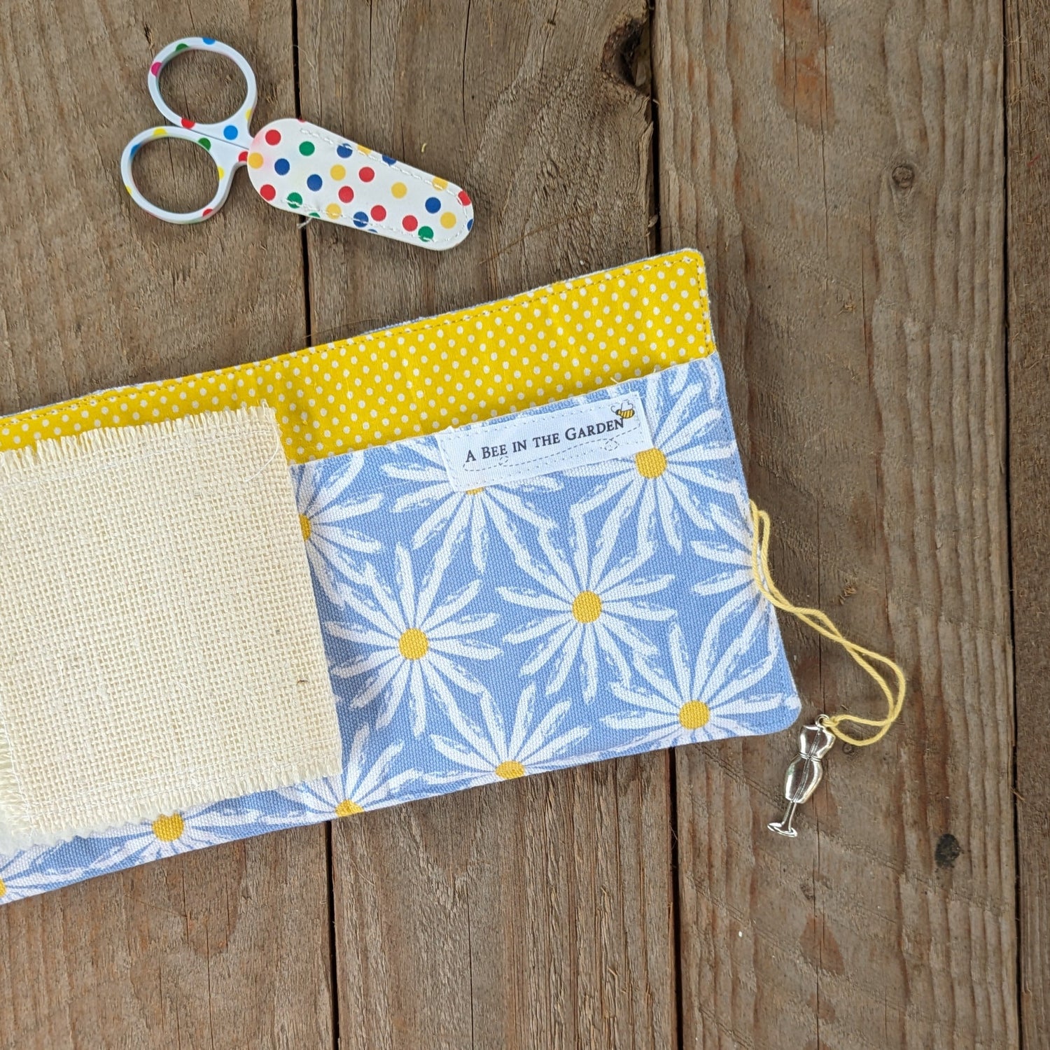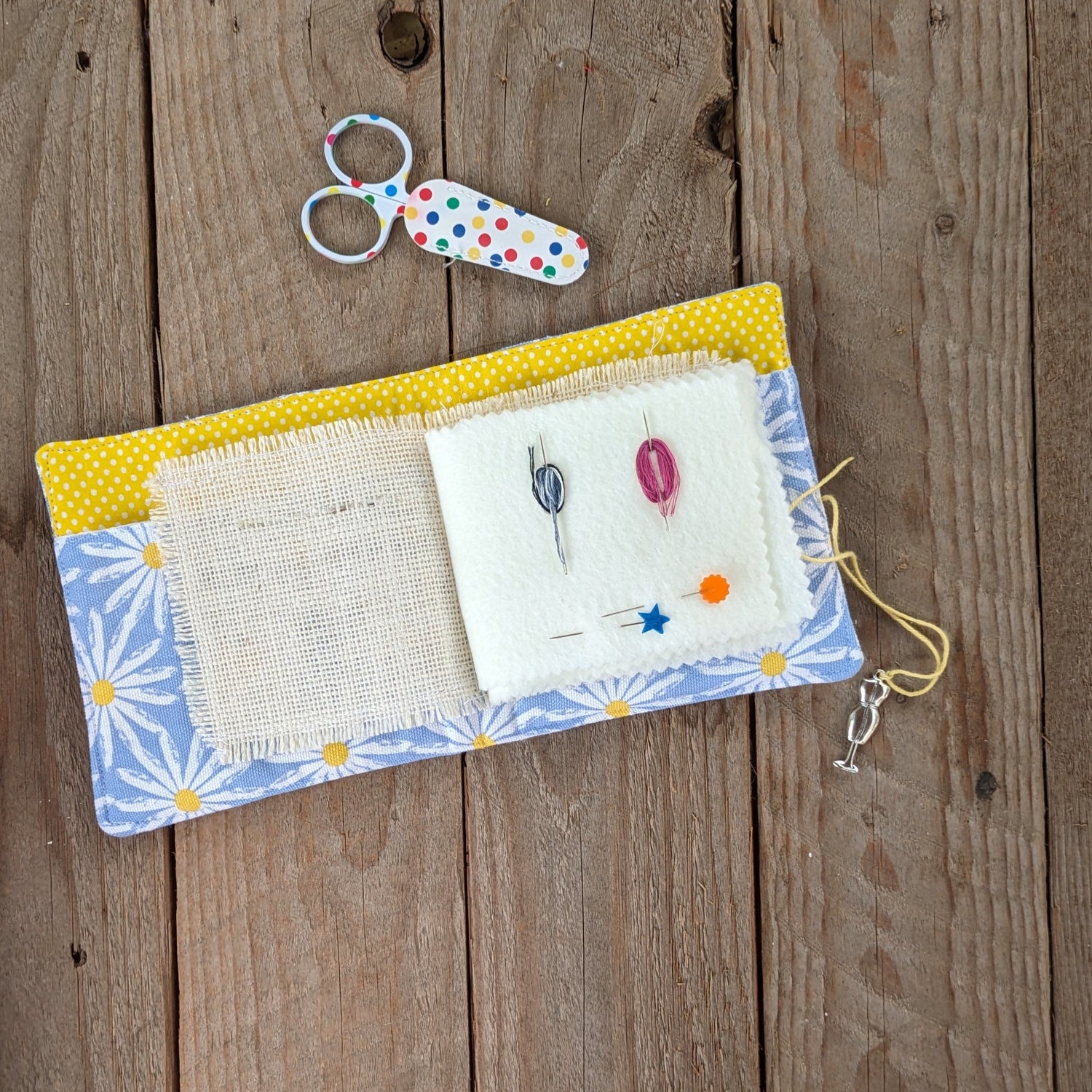 Yarn & button closure with a metal charm as a fun addition (please note that a random shape of charm will be added to each needlebook)