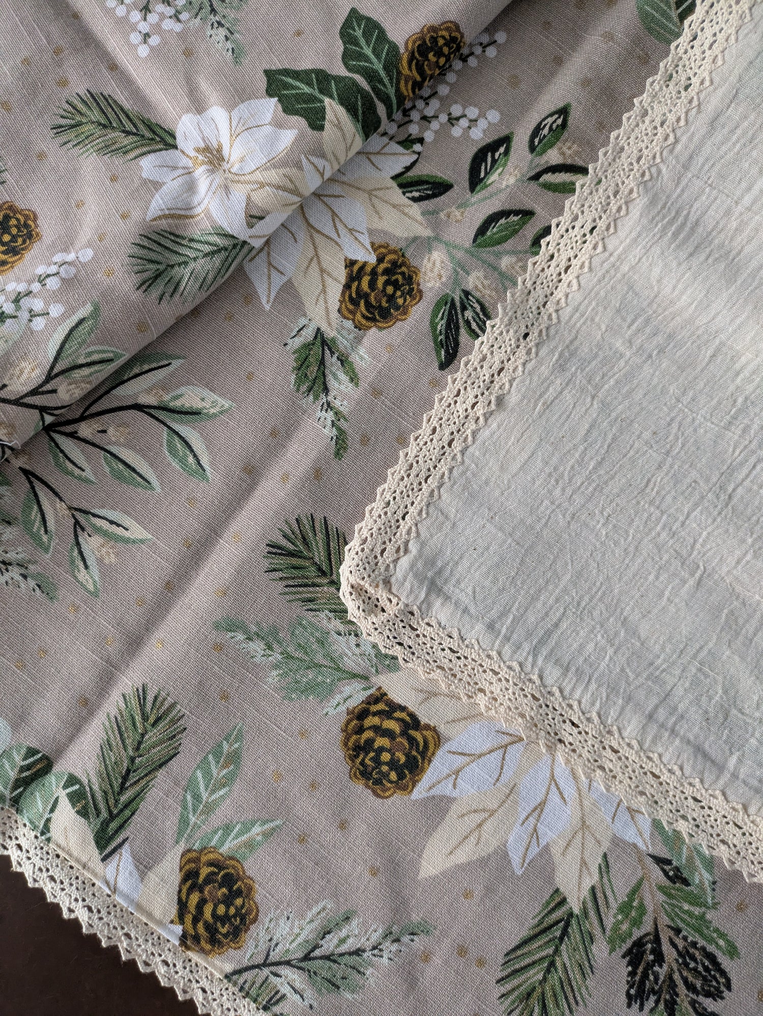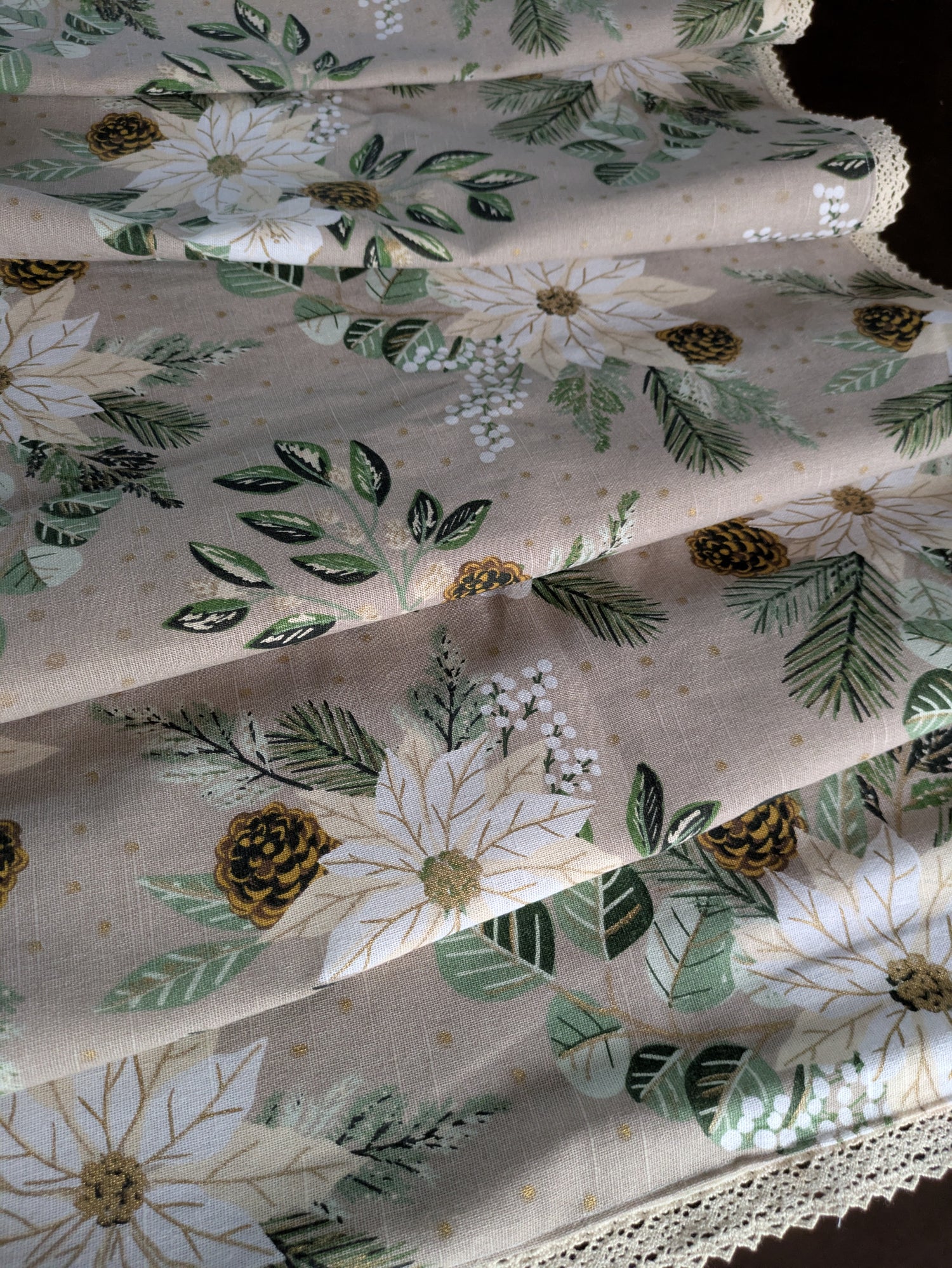 Vibrant poinsettia flowers bloom against a lush green backdrop, adding a pop of color to your holiday decor. Delicate golden dots add a touch of sophistication and sparkle. Perfect for Christmas gatherings and special occasions.