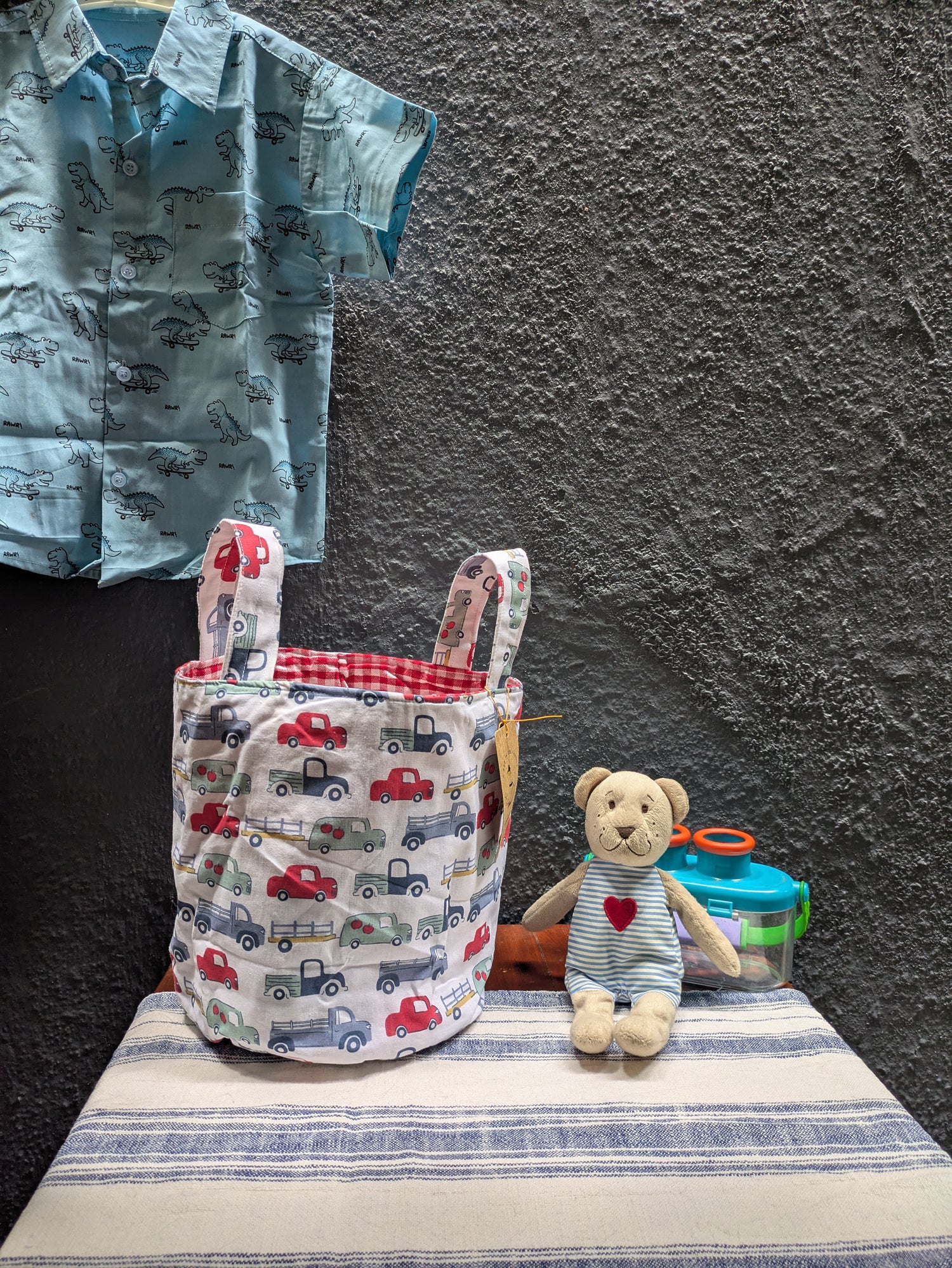 Toy bins made in cotton fabric . Good to organize toys and knick-knacks in kids room. Can also be used as laundry baskets, storage in studios and creative spaces.