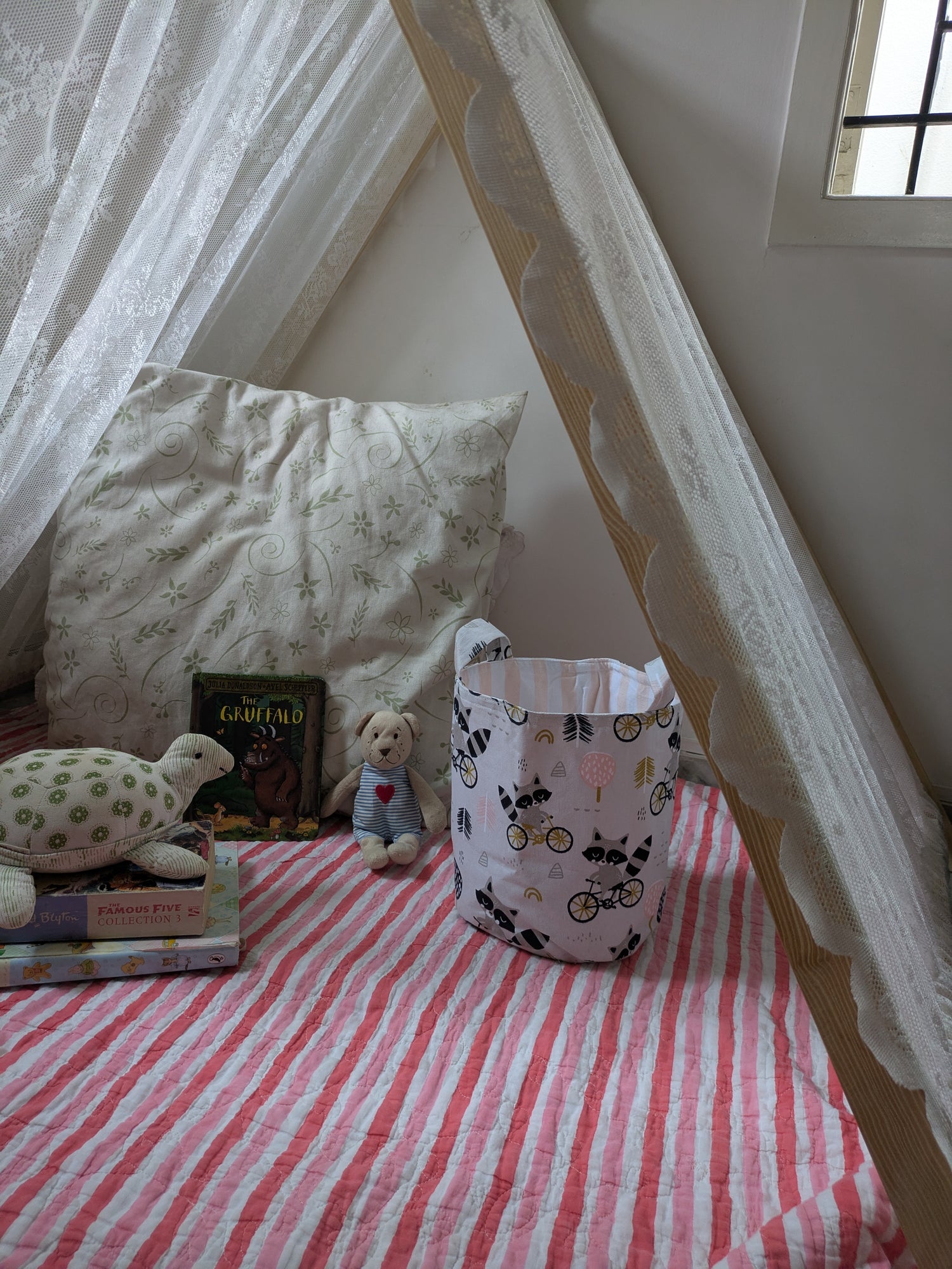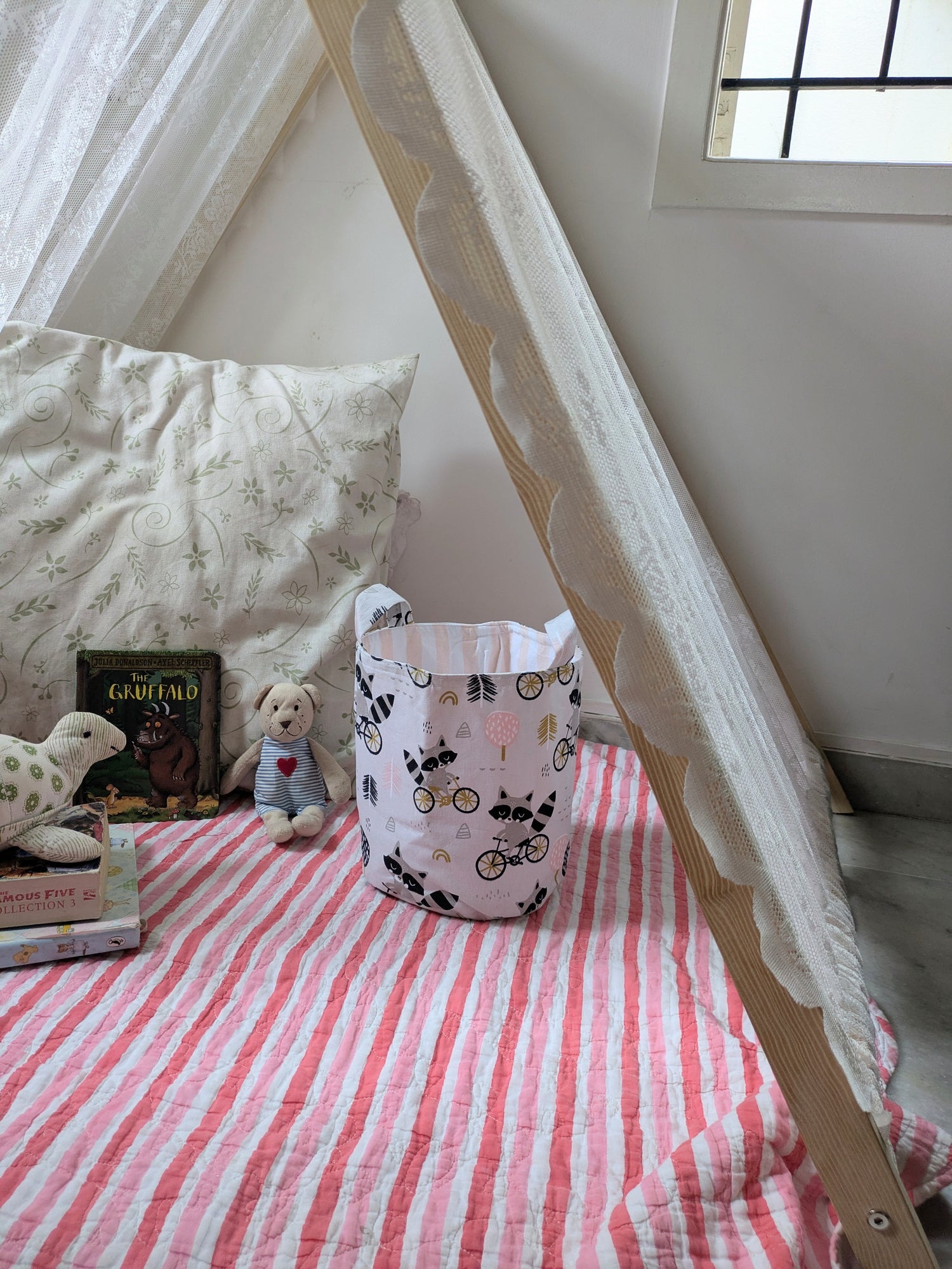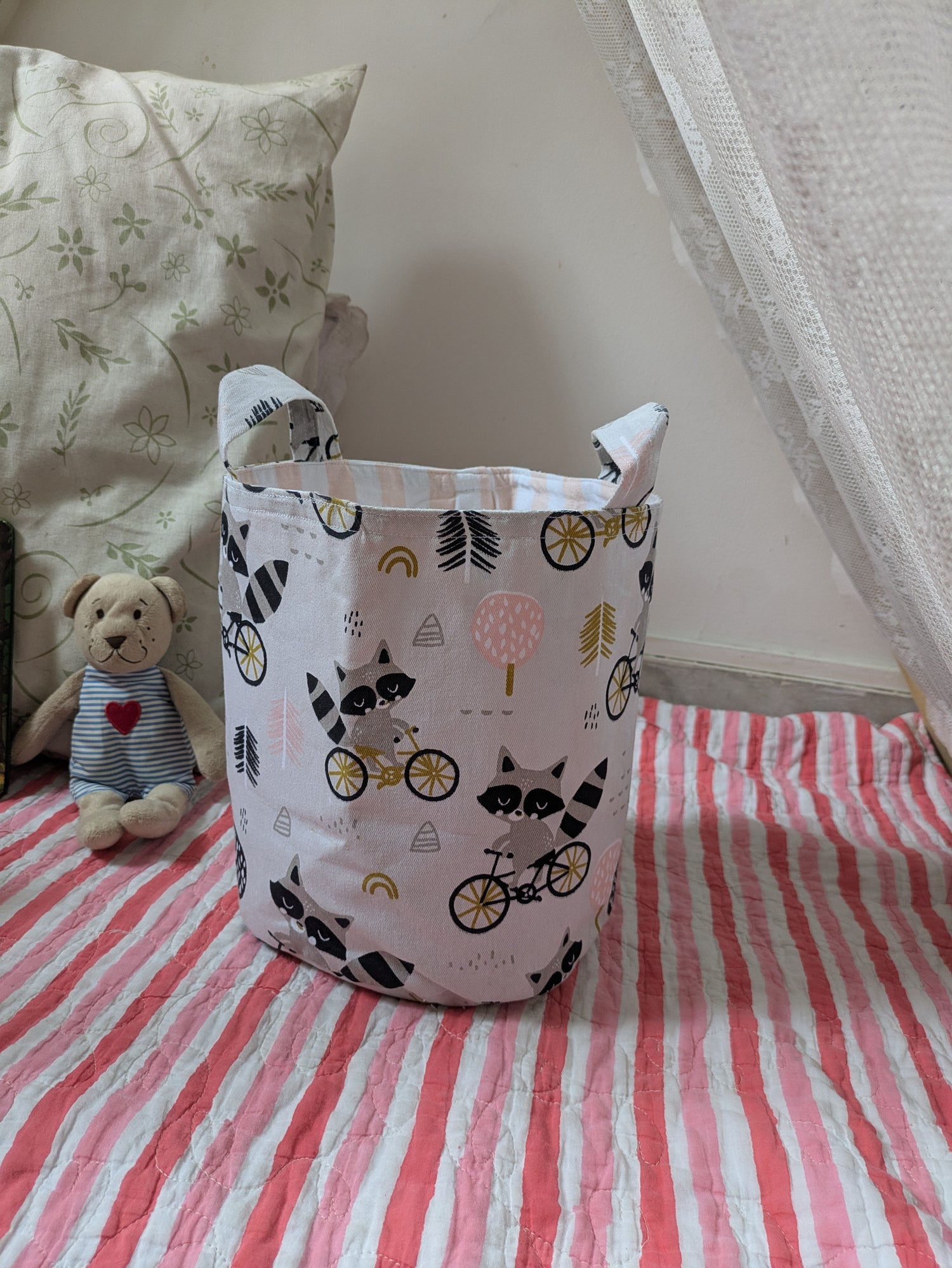 Toy bins made in cotton fabric . Good to organize toys and knick knacks in kids room. Can also be used as laundry baskets, storage in studios and creative spaces.